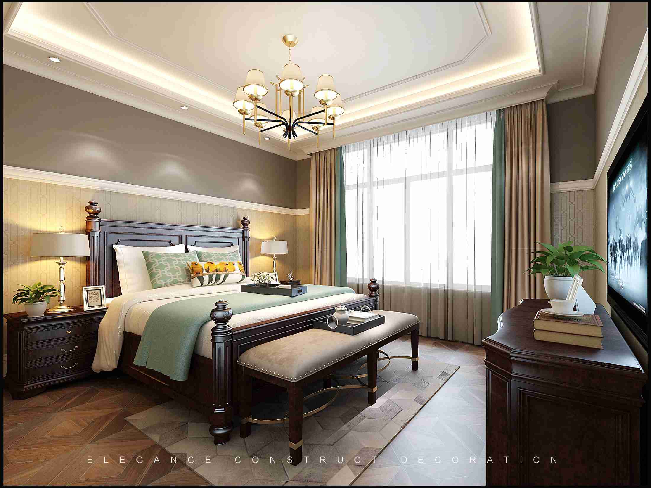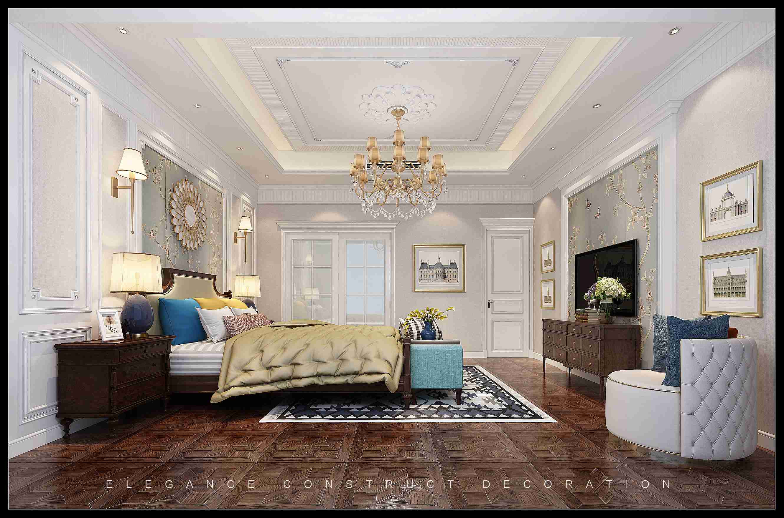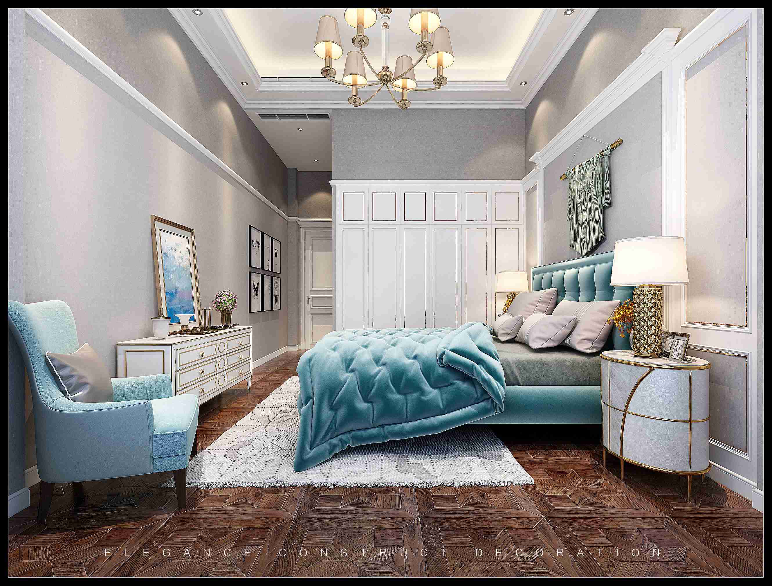 主臥室:整體空間色彩主要采用藍色與淺灰色,主要體現(xiàn)在背景墻、地面、窗簾等主要軟裝家具上,營造一種安逸舒適、優(yōu)雅氛圍,后加一點點暖黃色,將整個空間的色彩點亮,空間一下子就賦予了層次感,讓主人休息更貼心。