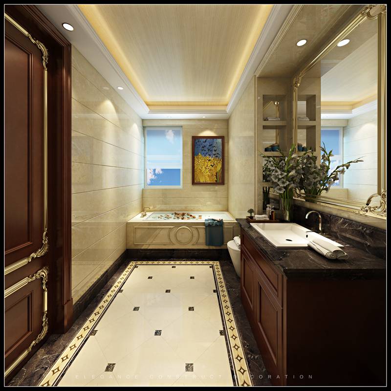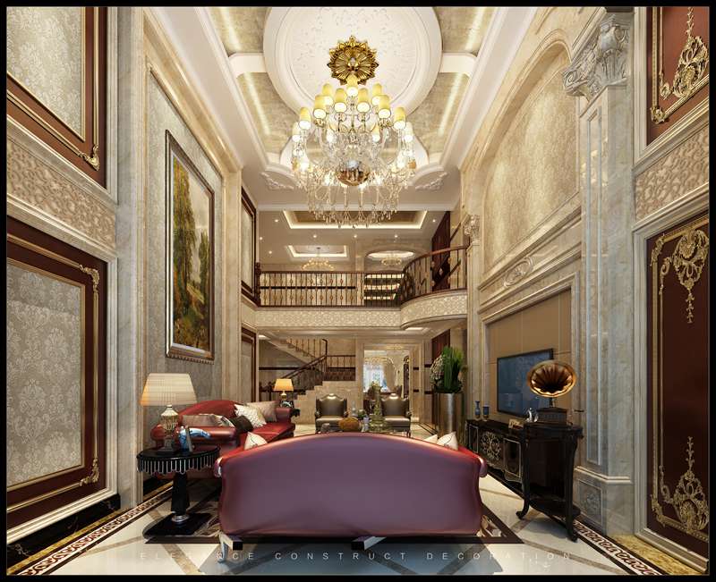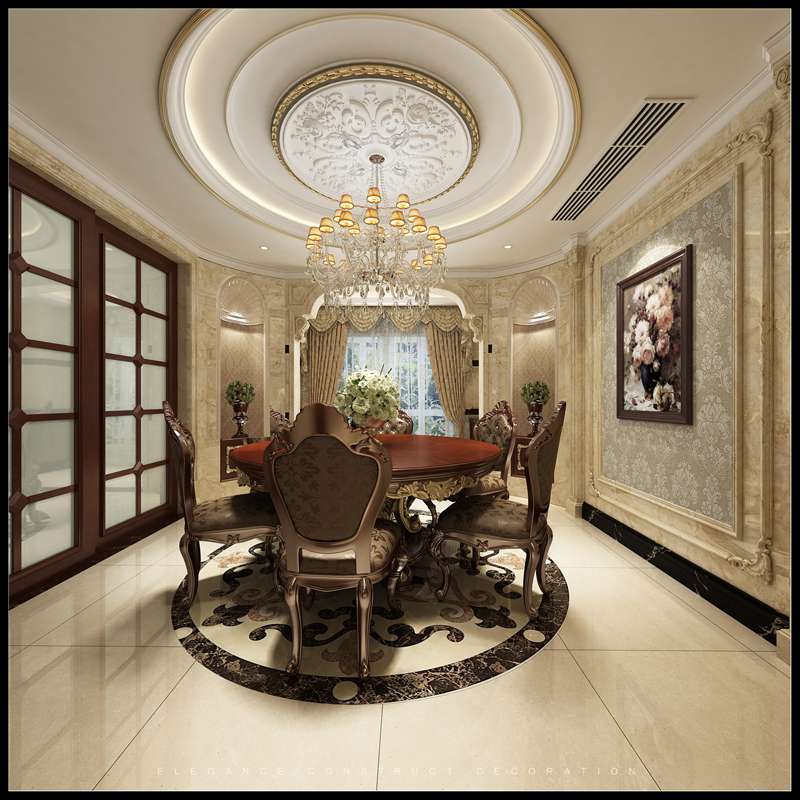 客廳以淡金色為主調(diào),舍棄傳統(tǒng)歐式的金黃色,整體效果相對(duì)于傳統(tǒng)歐式更加內(nèi)斂。圓形的吊頂設(shè)計(jì),搭配傳統(tǒng)的歐式奢華吊燈,整個(gè)空間的效果大氣又高級(jí)。整體采用軟包皮藝沙發(fā)、羅馬柱、壁畫等,多種裝修材料的運(yùn)用恰當(dāng)又不雜亂,一張金色的茶幾、一組酒紅色的皮藝沙發(fā),完美匹配整個(gè)空間的色彩,空間整體的裝飾效果得以有效的提升。