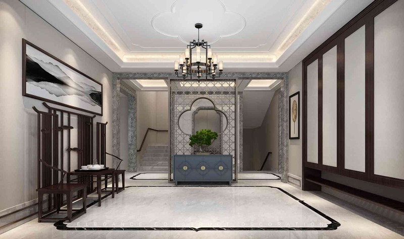 門廳的布置奠定了整個(gè)家的基調(diào)?;稳巳肽康氖怯蔁o數(shù)個(gè)大小如意相結(jié)合組成的銅質(zhì)屏風(fēng),藍(lán)色基調(diào)的如意柜上擺放著肆意的迎客松小盆景,與其相呼應(yīng)的頂部如意造型、地面以及頂部采用天空如意紋角裝飾、弧形的銀箔處理等等造型寓意吉祥如意,空間意境低調(diào)而奢華。