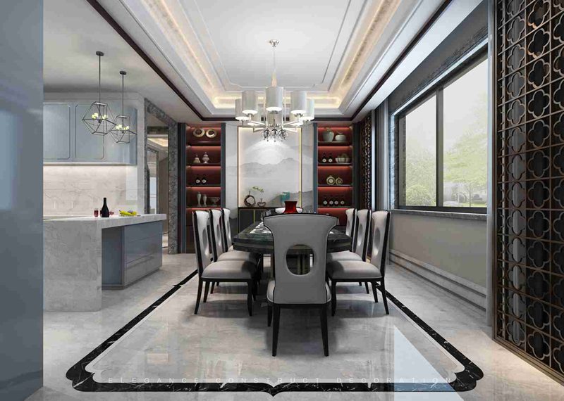 “如果奇跡有顏色,那一定是中國紅!”它以其豐富的文化內(nèi)涵,氤氳著古色古香的氣息,延續(xù)著盛世氣派。餐廳與書房設(shè)計(jì)手法相似,立柱采用藍(lán)色硬包,襯底采用中國紅,整體純度降低比例加大、藍(lán)色比例縮小。紅與藍(lán)顏色比例選用低調(diào)大氣,構(gòu)成一道繽紛的傳統(tǒng)色彩風(fēng)景線。