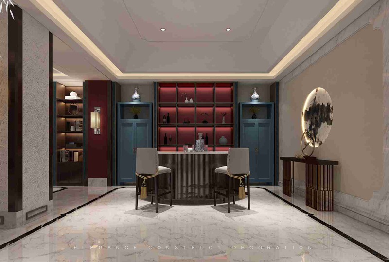 一層地下區(qū)域全部打通。從樓梯下至一層,直對(duì)水吧區(qū)域,呈現(xiàn)眼前的是一個(gè)集美酒、美景、文化的共享空間。它的設(shè)計(jì)脫胎于中國雅文化色彩對(duì)其空間運(yùn)用表達(dá),用景泰藍(lán)、中國紅等皇家柜體用色反應(yīng)設(shè)計(jì)之美。又以山水畫吧臺(tái)弧形線條柜、青花瓷瓶擺件、玉石小景、祥云雕刻創(chuàng)造經(jīng)典中式情境,是一個(gè)充滿雅致格調(diào)的水吧