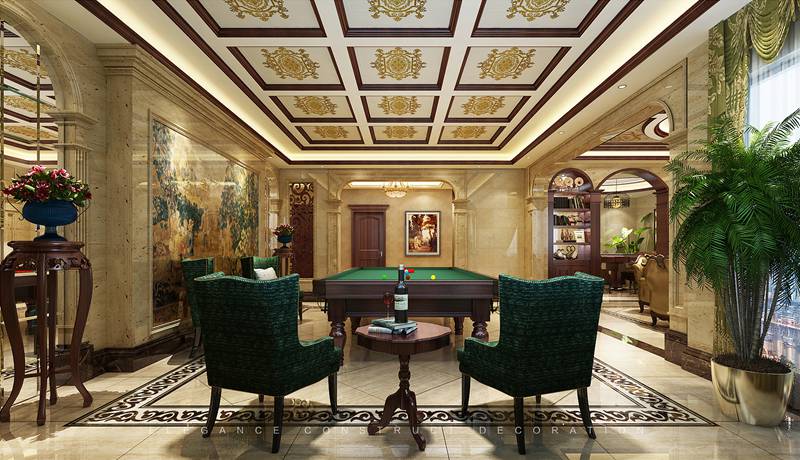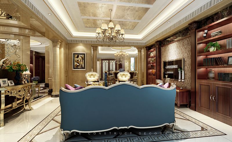 客廳處于挑空結(jié)構(gòu)之下,設(shè)計時發(fā)揮古典歐式風(fēng)格的主元素,融入現(xiàn)代的生活元素。不論是挑高的羅馬柱造型,還是豪華的壁爐,都體現(xiàn)居住本身的豪華與大氣。