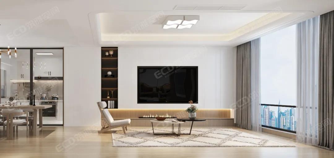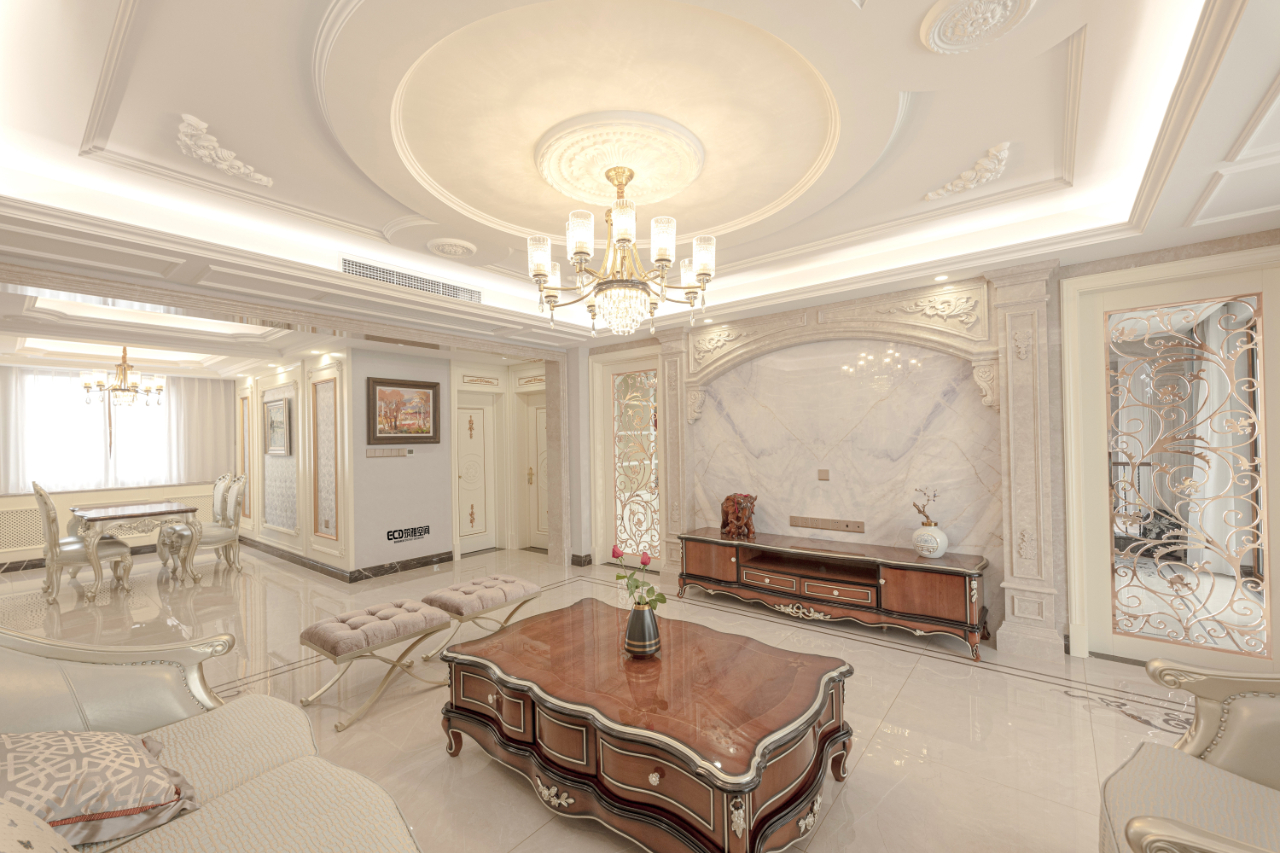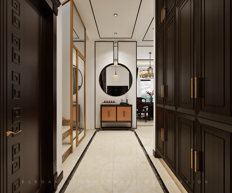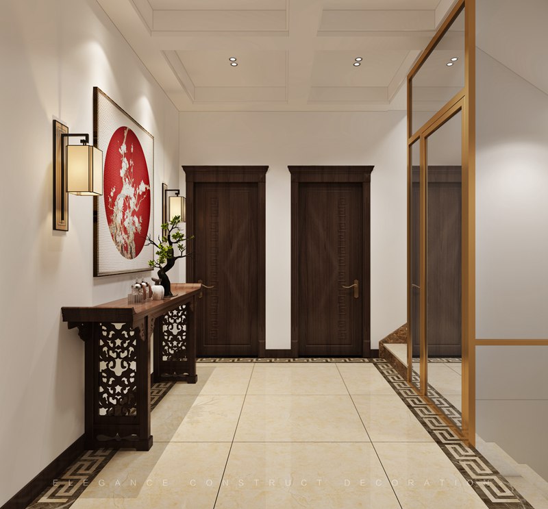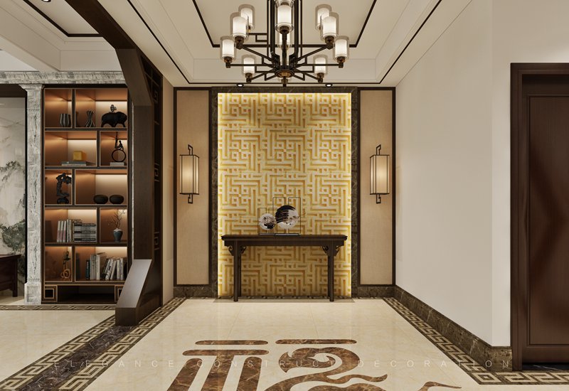 本案一層以客廳為主,外陽臺封為室內(nèi)部分,設(shè)計(jì)造型吊頂隱藏為重組空間而裸漏出來的梁。通過重組,實(shí)現(xiàn)大空間客廳,擺放花梨木家具套件。電梯出口地面設(shè)計(jì)福字,寓意開門納福。