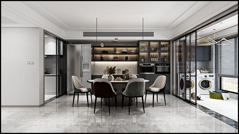 餐邊柜中間鏤空設(shè)計(jì),放置幾瓶美酒,讓餐廳更具有現(xiàn)代感