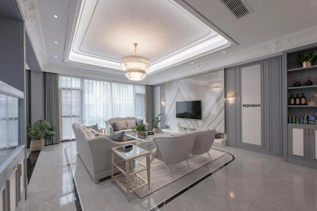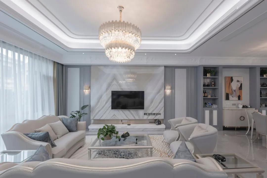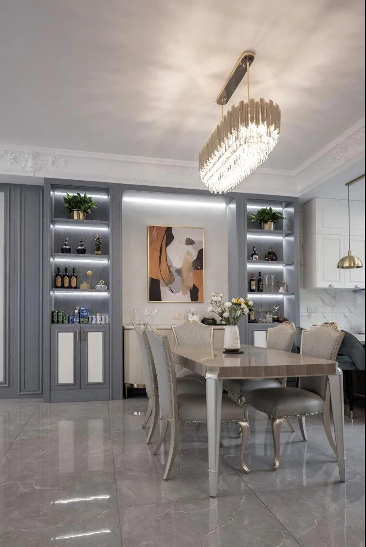 通體靈動(dòng)的大理石,與質(zhì)感線條交相輝映,衍生出不同層次的變化,隨性且自然。美式現(xiàn)代造型吊燈安靜的懸掛上方,如同空間的柔化劑般,柔化了空間的生硬線條,增添空間層次感,給人帶來了不少浪漫聯(lián)想。通體開敞的空間,從局部到整體無不體現(xiàn)著輕盈通透的視覺感。