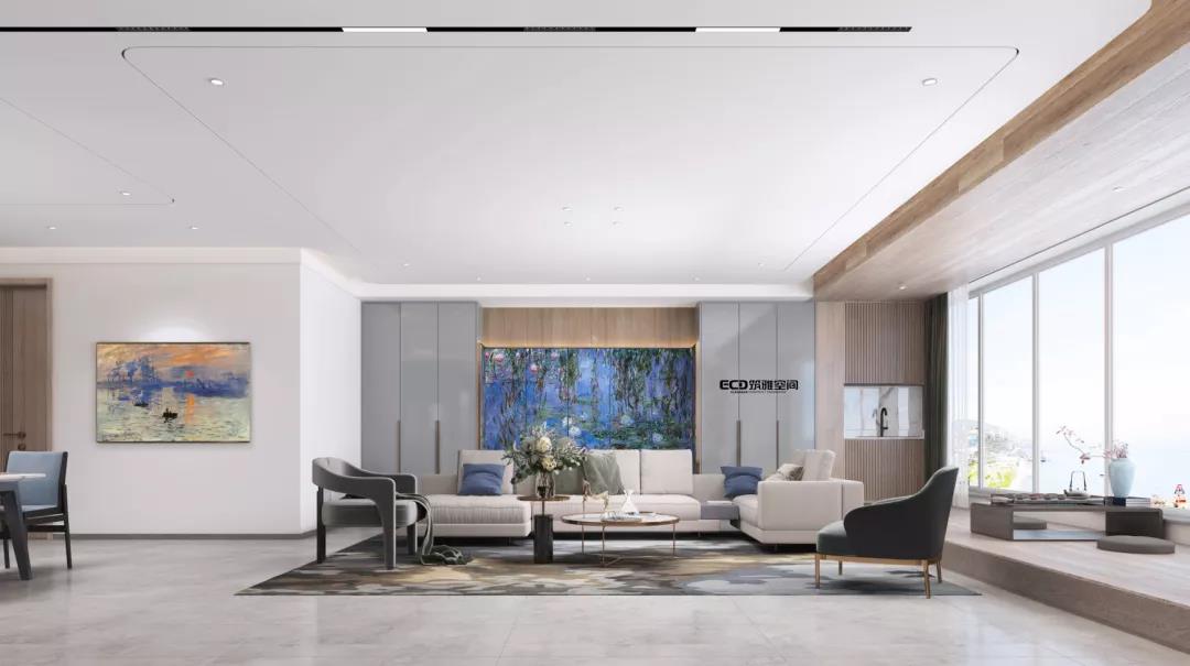 步入客廳,就被兩幅藝術(shù)畫作所吸引。威海裝飾的掛畫來自法國印象派畫家莫奈的《日出·印象》,這幅畫描繪的是法國勒阿弗爾港清晨的風(fēng)景。結(jié)合環(huán)境,取其意境,與本案設(shè)計(jì)相輔相成。