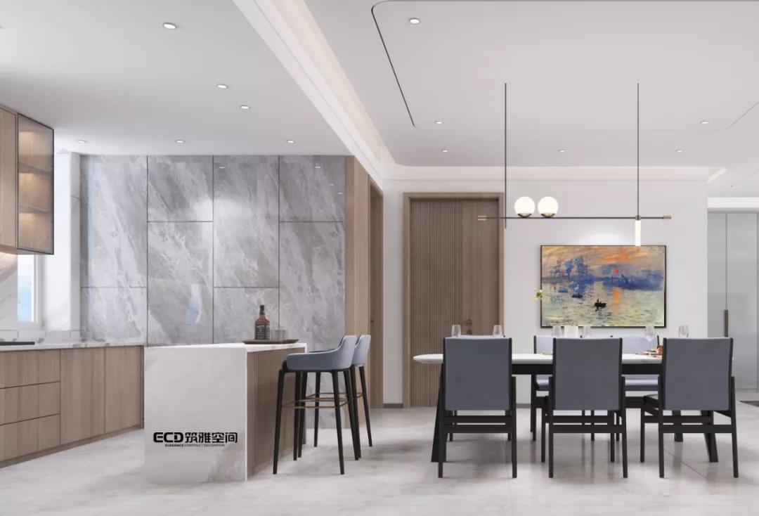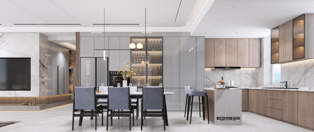 將餐廳與客廳一以貫之,增加空間的互動(dòng)性,光線通透性,及視線開闊性,更增進(jìn)了家人間的溝通與情感,營造舒展輕快的氛圍,開啟自在真實(shí)的休閑與用餐體驗(yàn)。餐廳是家人情感重要的鏈接之處,設(shè)計(jì)師采用餐廚一體的設(shè)計(jì)手法,開放式的廚房功能細(xì)分,儲(chǔ)物充足,最大化利用空間。