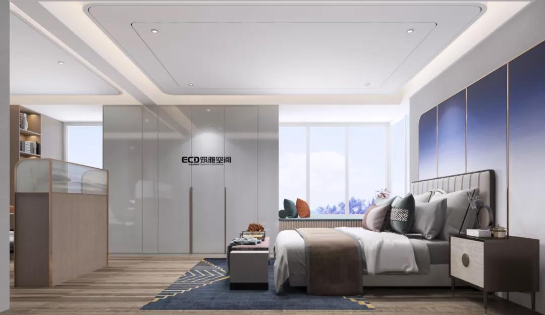 主臥背景墻選用了藍(lán)白漸變,清晨溫暖的陽光將人從美夢(mèng)中喚醒,精致的飄窗為素雅的睡眠區(qū)域增添了一抹實(shí)用與安穩(wěn)。