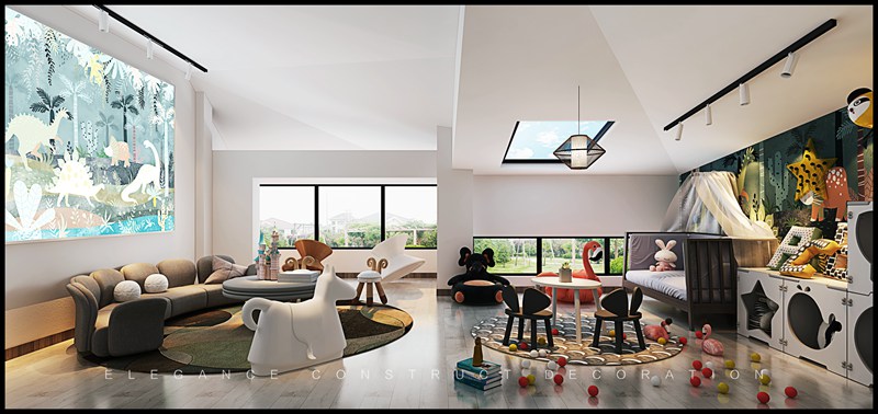 二樓空間主功能是一個親子游樂區(qū),設(shè)計師加入火烈鳥、白馬等布偶裝飾,讓整個空間更加靈動起來,在這里進行著創(chuàng)造性的對話。龔老師運用巧妙的設(shè)計解決原本采光的問題,開闊的視覺為整個設(shè)計帶來自由閑適的感覺。讓孩子在此自由成長,享歲月靜好,柔和且寧靜。