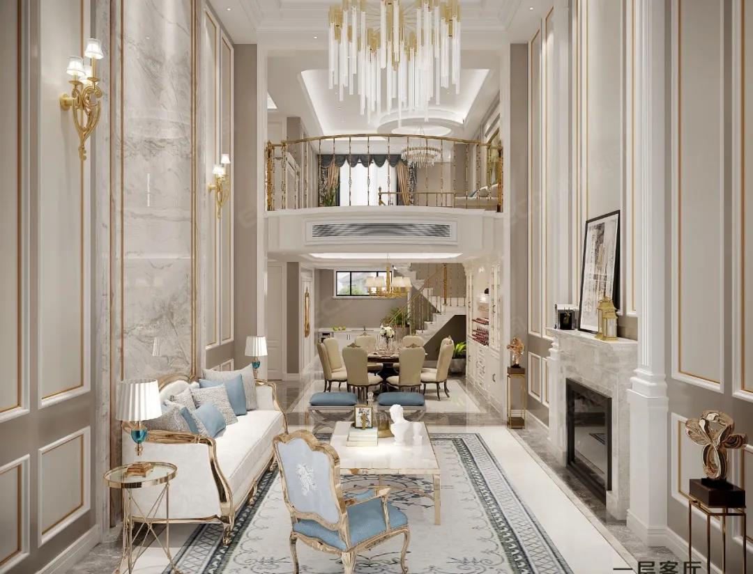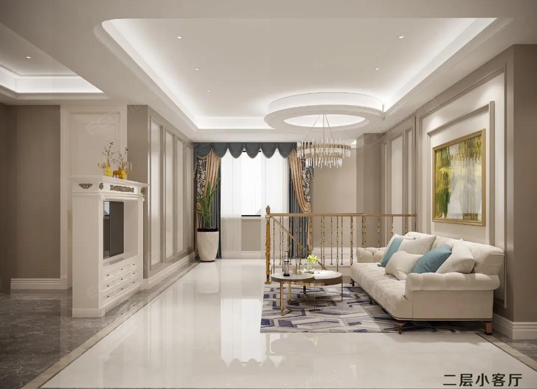 挑空客廳設(shè)計具有簡歐風(fēng)大氣典雅的歐式輪廓,同時帶有些許時尚的簡約感,以米、白等色調(diào),點綴各種清透、溫暖的淺藍(lán)、黃等色,整體帶有水洗般的溫暖澄澈感。藍(lán)色系的軟裝配飾選用與落地窗外春城碧藍(lán)如洗的天空一脈相連,有著清秀明朗、簡約雅致韻味感。