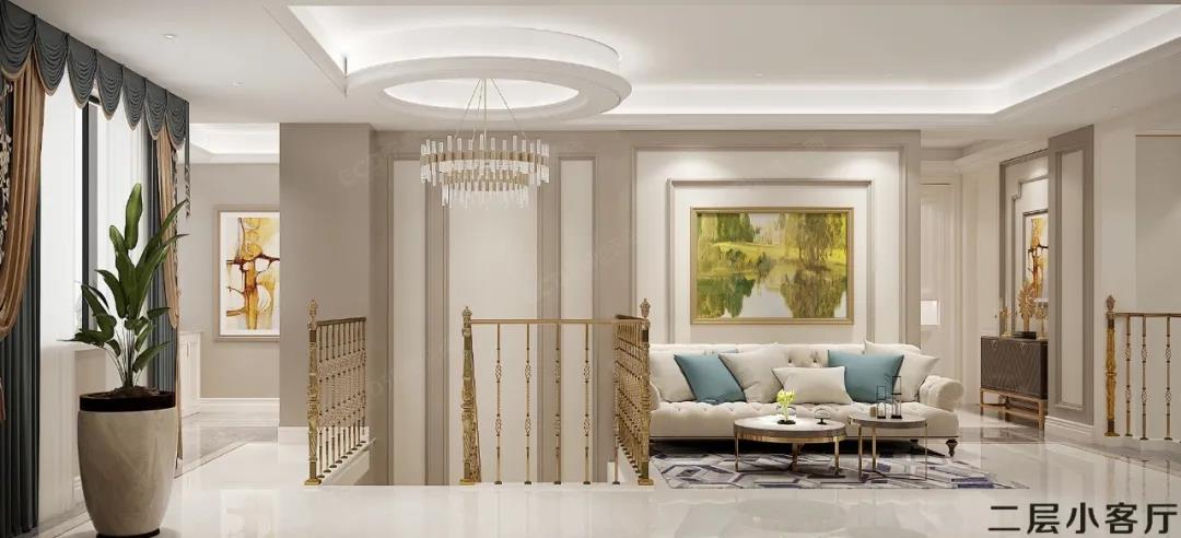 沿著樓梯拾級而上,便可到達(dá)二層小客廳空間。小客廳以暖色調(diào)為基礎(chǔ)色調(diào),讓客廳顯得干凈明快,靈動藝術(shù)的燈飾、綠植、掛畫,巧妙地塑造了客廳的空間感,在充足的光線下煥發(fā)出充沛的朝氣與活力,令人感到溫暖而舒暢。