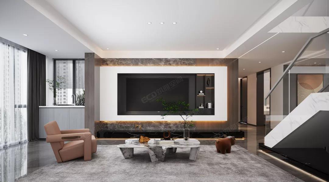 客廳,將都市優(yōu)雅的格調(diào)精煉為流暢的空間線條,靈動(dòng)的橘色、淡雅的灰色、沉謐的黑色等色彩的運(yùn)用,激蕩著客廳空間的鮮活氣場(chǎng)。