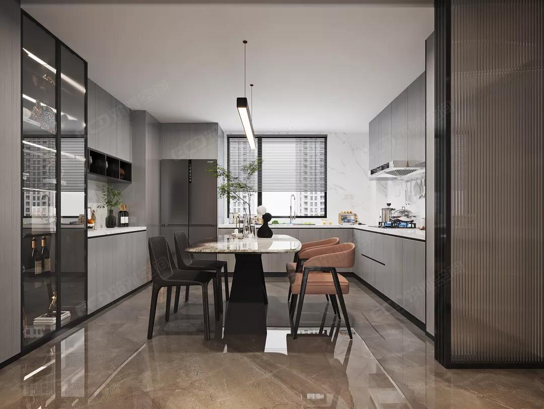 餐廳依偎著廚房,簡(jiǎn)練的線條托起華美的肌理,色調(diào)與材質(zhì)呈現(xiàn)疊加魅力。另外,隱藏式冰箱、酒柜等具有強(qiáng)大的收納功能,讓空間的功能得到新的補(bǔ)充,更具延伸與通透感。