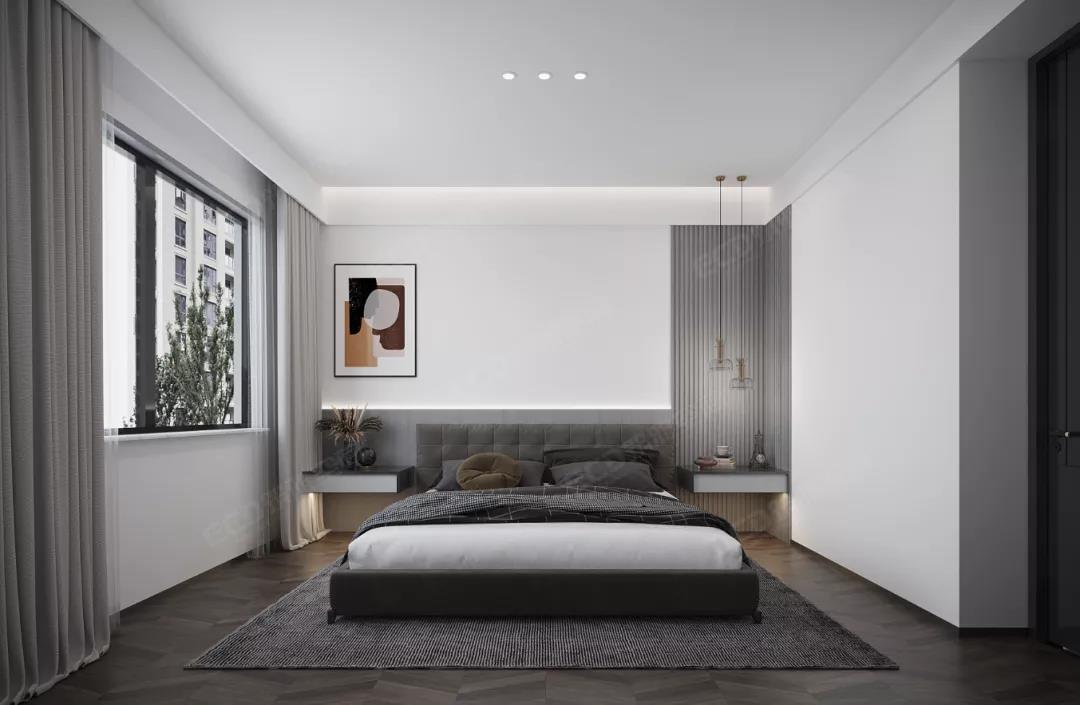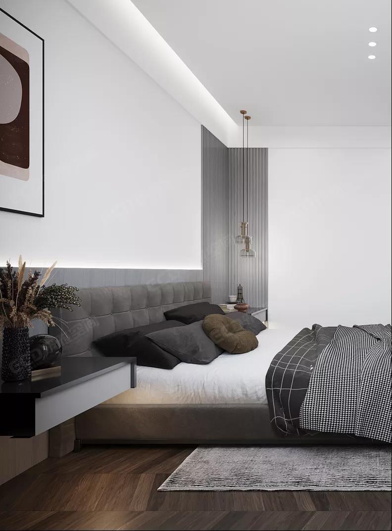臥室靜謐的色調(diào)搭配干練的線條,摒棄傳統(tǒng)繁雜風(fēng)格,背景畫(huà)與金屬燈飾的巧妙混搭,給人簡(jiǎn)約時(shí)尚且不失溫馨舒適的感覺(jué),豐富整個(gè)空間的層次感。