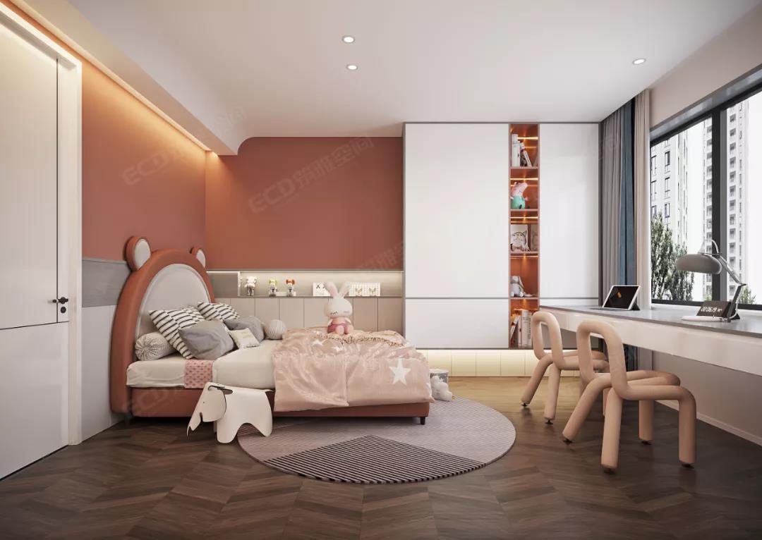 孩子房以明朗色彩呼應(yīng)活力四射的青春,巧妙地運(yùn)用床品、擺件、桌椅、玩偶等軟裝配飾,營(yíng)造空間別致的時(shí)尚韻味。通過(guò)色彩的深淺對(duì)比運(yùn)用,拉伸空間的層次感,也讓整體空間更加生動(dòng)、活潑。