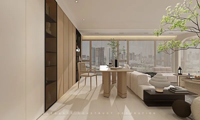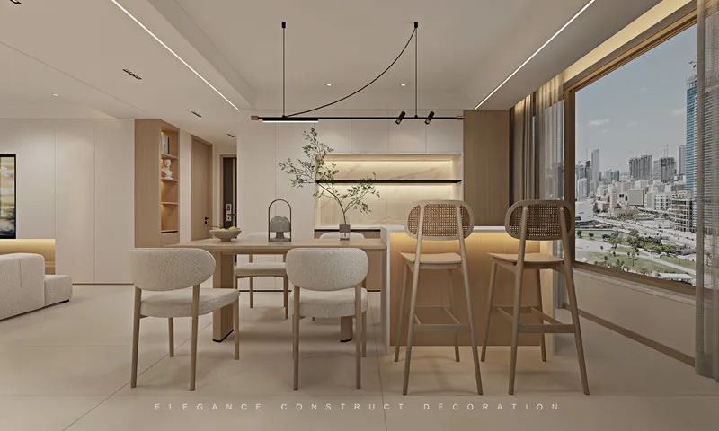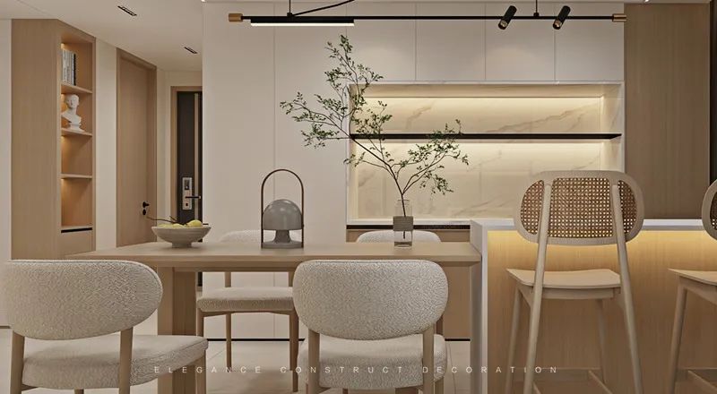 餐廳高柜的運(yùn)用使得整體達(dá)到整體貫連一致色系的簡約感。