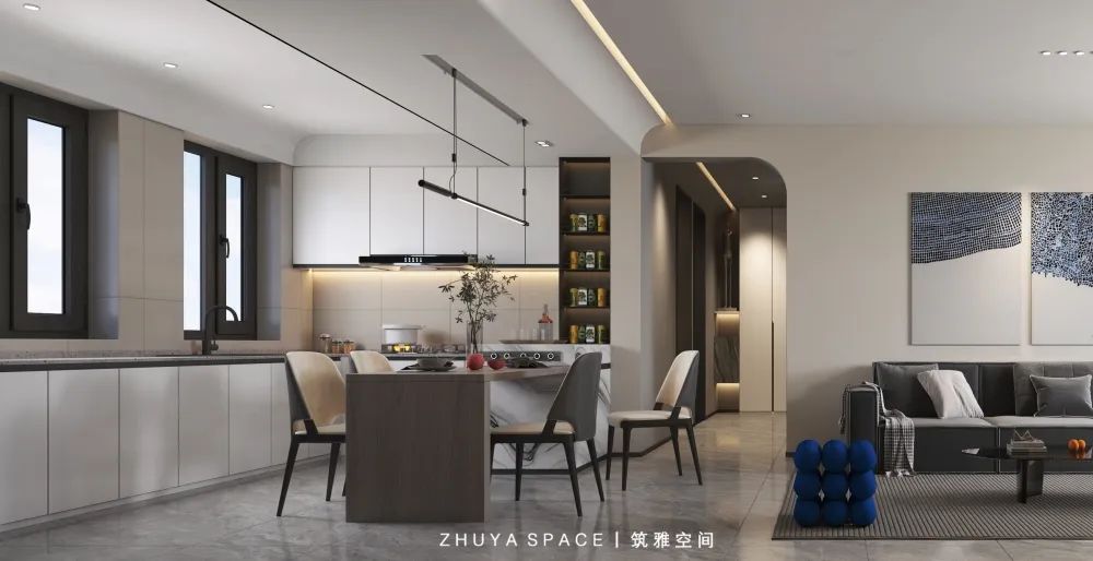 開放一體的客餐廳,“留白”的藝術(shù)理念,堅持去掉多余的元素,從不刻意去填滿生活,營造出空靈不俗氣的高級空間。