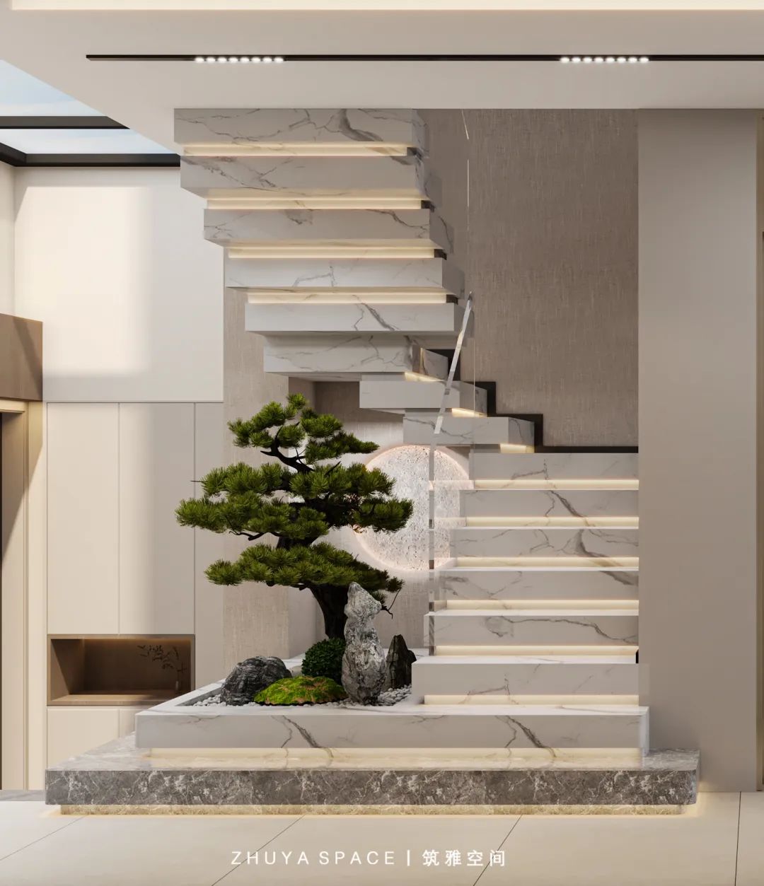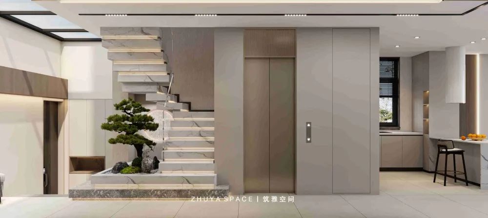 樓梯踏步上的形體宛如靈動的山峰,為整個空間增添了一抹從容優(yōu)雅。