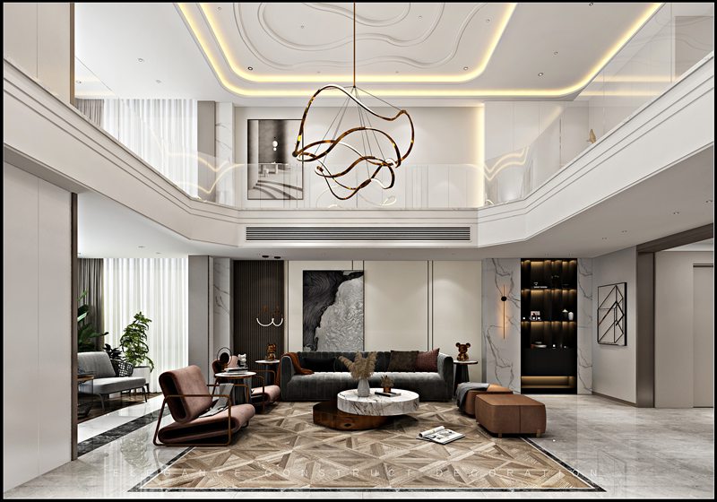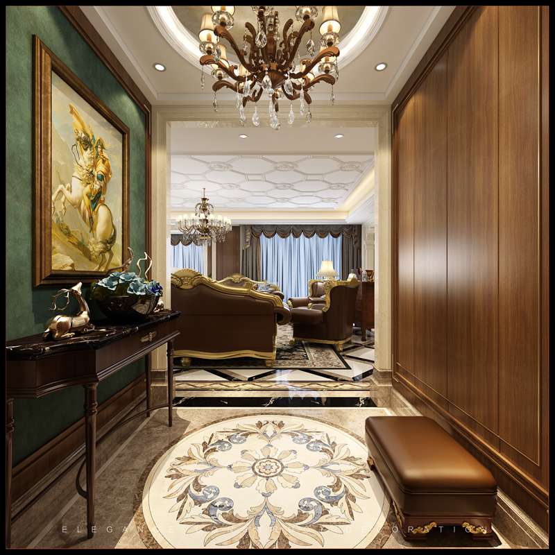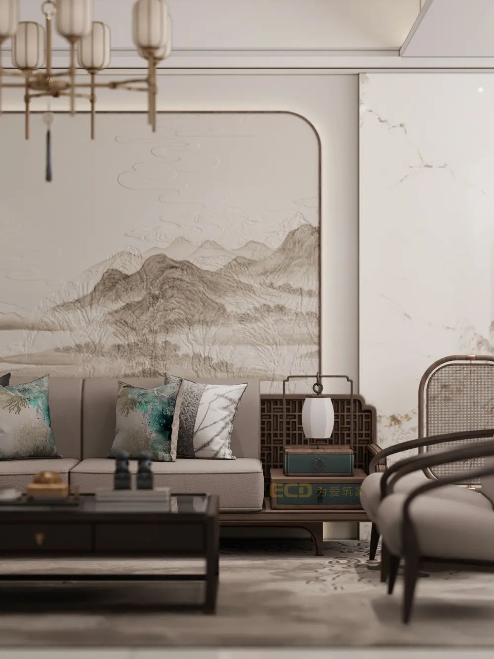 入戶以左側(cè)為客廳,山水鋪滿整面墻壁,木質(zhì)與布藝材質(zhì)在自然光下給人以浪漫致遠(yuǎn),復(fù)古的正式吊燈,讓整個(gè)空間感十足。