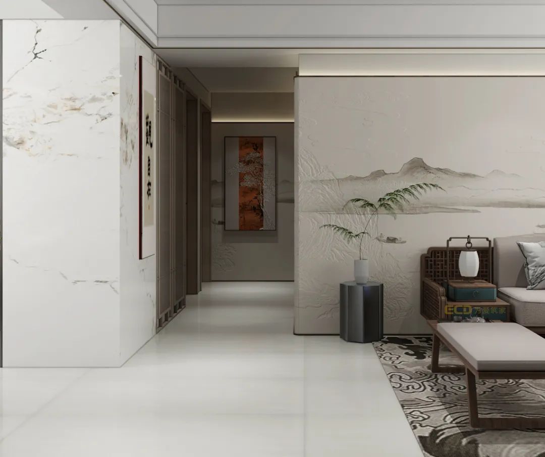 傳統(tǒng)的綠植擺放,與中式精粹青瓷鼓凳,中式元素的空間,使得自入戶起,留給人無(wú)限遐想。